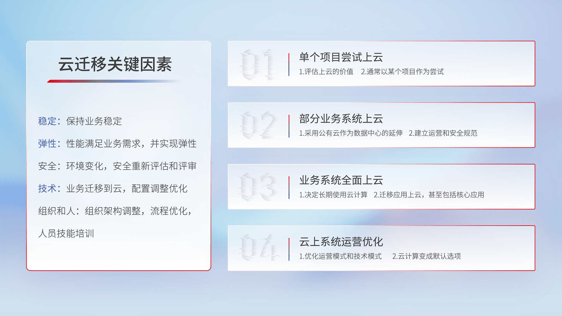 结合实际业务,,从规划设计、、、、云平台选型、、云原生改造、、、数据迁移、、集成交付,,,迁移全过程为客户识别最佳上云路径,,做好风险识别管理,,,设计网络架构、、、身份权限、、、安全审计合规、、、操作审计、、、、日志审计、、监控告警策略、、多站点容灾设计等,,,对云上基础设施进行整体规划,,提升IT治理水平,,,以满足弹性、、、、高可用、、、、高性能的需求。。。