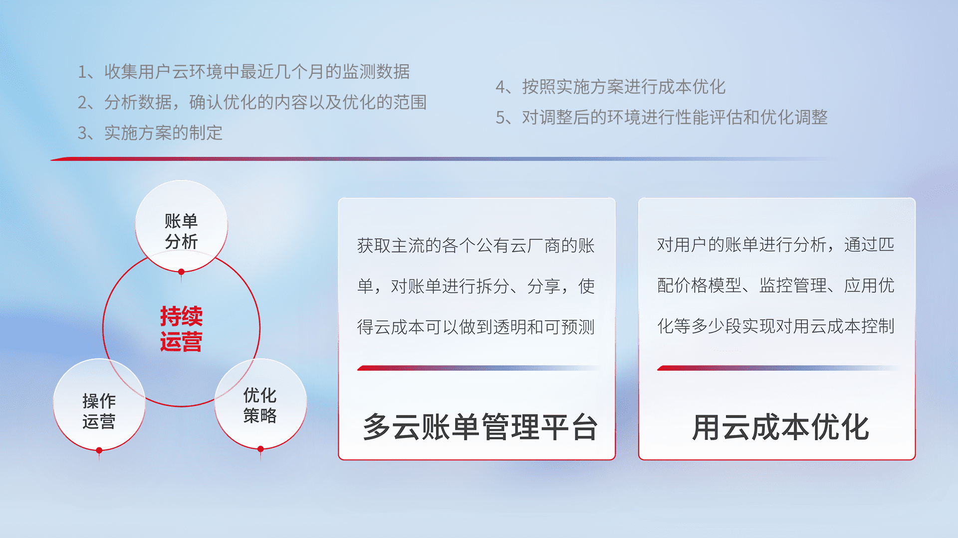 通过多云纳管,,以统一的资源数据模型把客户的云资源进行抽象和封装,,进而实现对多云资源的统一操作,,保障云资源管理的可靠性、、稳定性与可用性。。量身定制化运维内容,,,配置、、开发运维、、、补丁管理、、、备份、、监控、、、认证和访问管理、、、审计和日常巡检等,,保障在用云过程中的可靠度,,,稳定度以及高可用率。。。