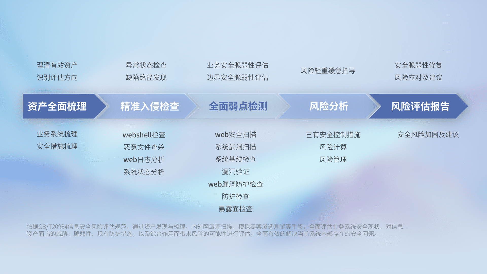 针对客户行业特性,,以专业的安全服务+多厂商联合解决方案提供专属的一站式安全管理服务,,,,帮助客户全面感知网络空间威胁,,,,基于识别、、、检测、、分析、、、、防护、、、监测、、、、响应的服务理论模型,,,,从方案咨询、、、集成交付、、、评估验证、、、优化加固、、、运维运营,,,致力于为客户提供完整的闭环管理式安全服务。。。。以实战经验为客户打造高抵御风险的安全体系,,帮助客户发现威胁、、、对抗威胁、、、处置威胁,,,,不断积累安全对抗能力,,,,持续保障数字化安全。。